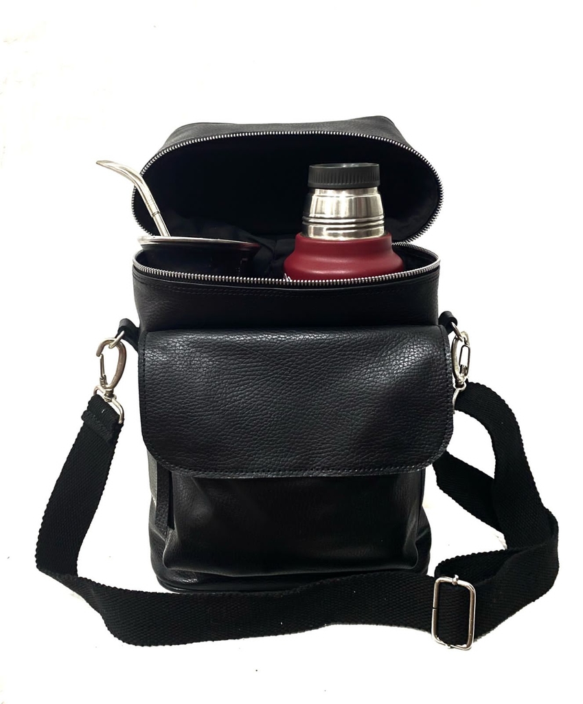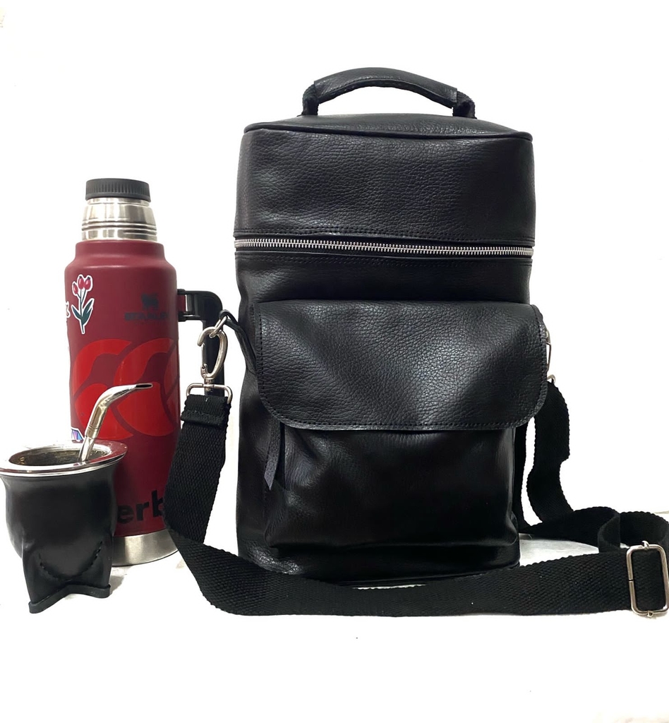Matera confeccionada en cuero genuino, totalmente forrada, con división interna para llevar el termo y el mate de forma segura y organizada.